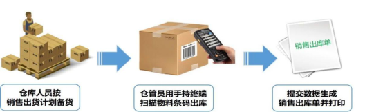 倉庫人員根據(jù)銷售人員的出貨計(jì)劃,安排銷售發(fā)貨。倉庫人員使用手持終端設(shè)備掃描源單發(fā)貨通知單,并逐一掃描成品條碼,確認(rèn)出貨數(shù)據(jù)無誤后,系統(tǒng)生成銷售出庫單。
