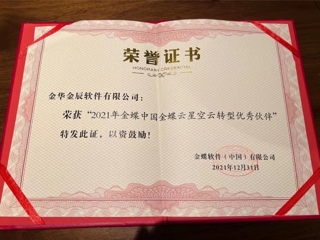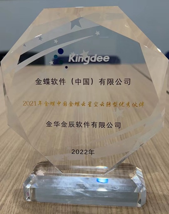 金華金辰軟件有限公司榮獲金蝶集團(tuán)“2021年金蝶中國云轉(zhuǎn)型優(yōu)秀伙伴”的榮譽!